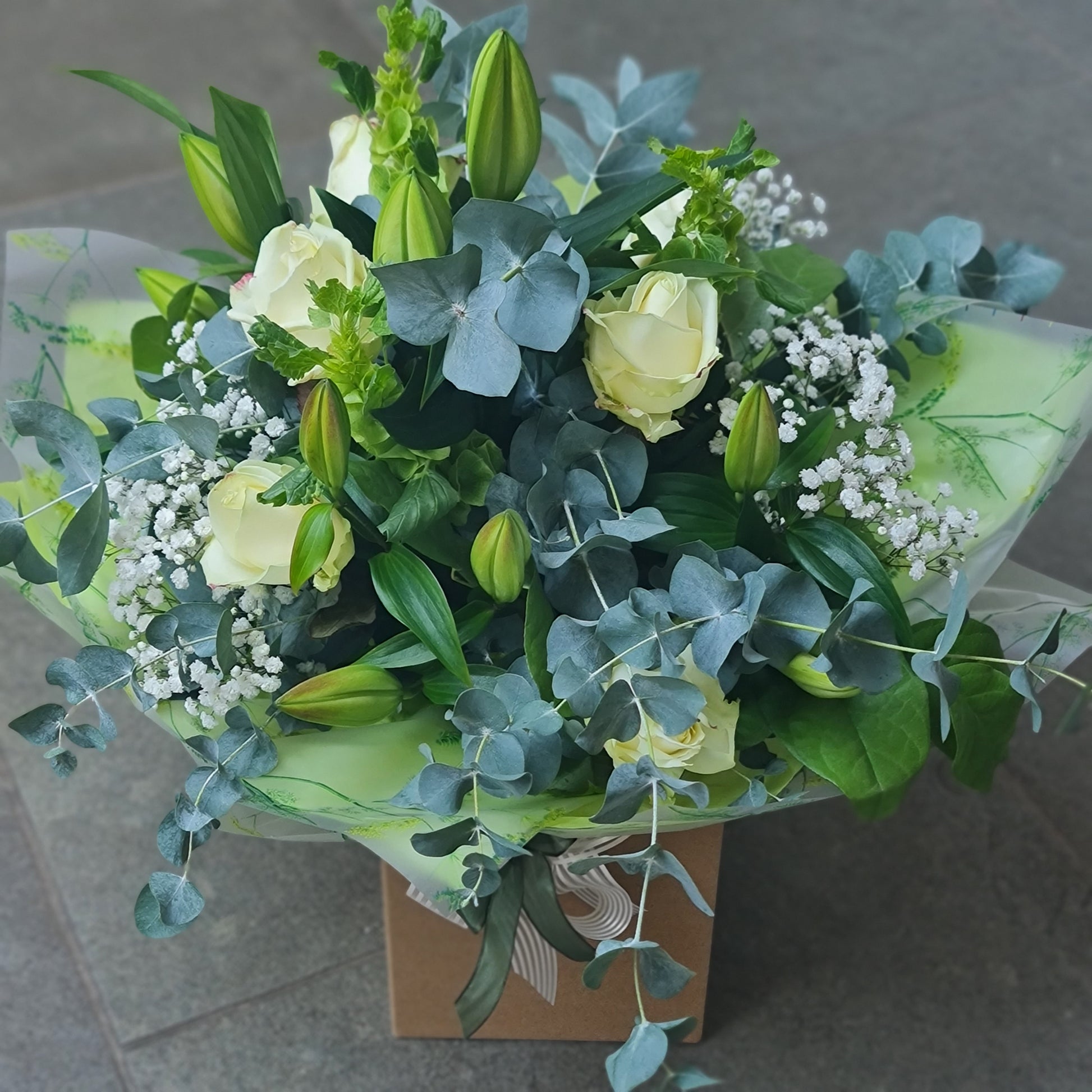 This incredible design of white lilies arranged with White Avalanche roses and Eucalyptus. This is a beautiful gift for someone special.