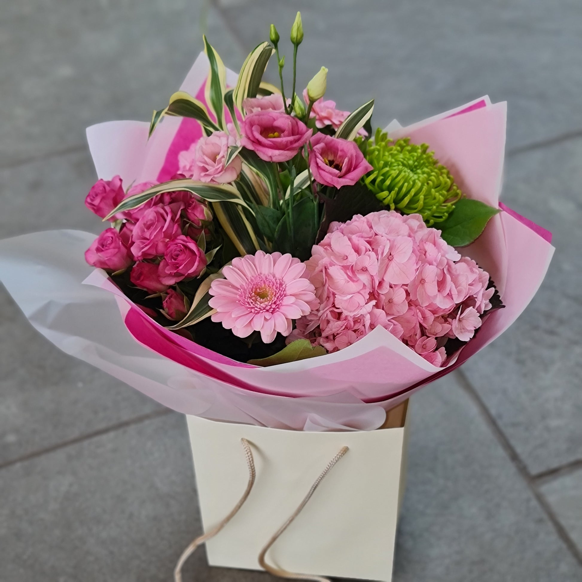 A stunning Aqua handtied made up of pink flowers. Including a Hydrangea, Gerbera and Lisianthus