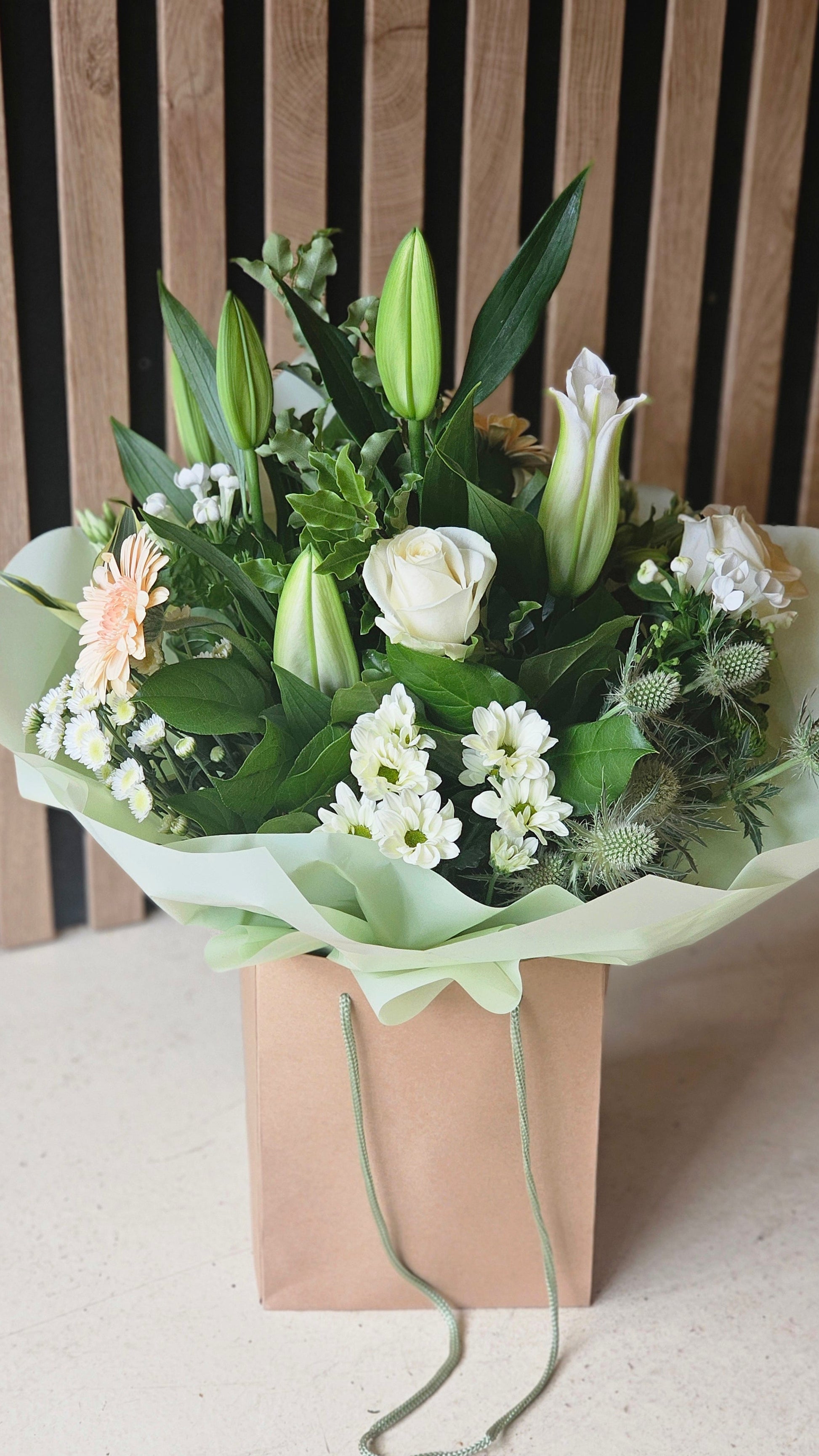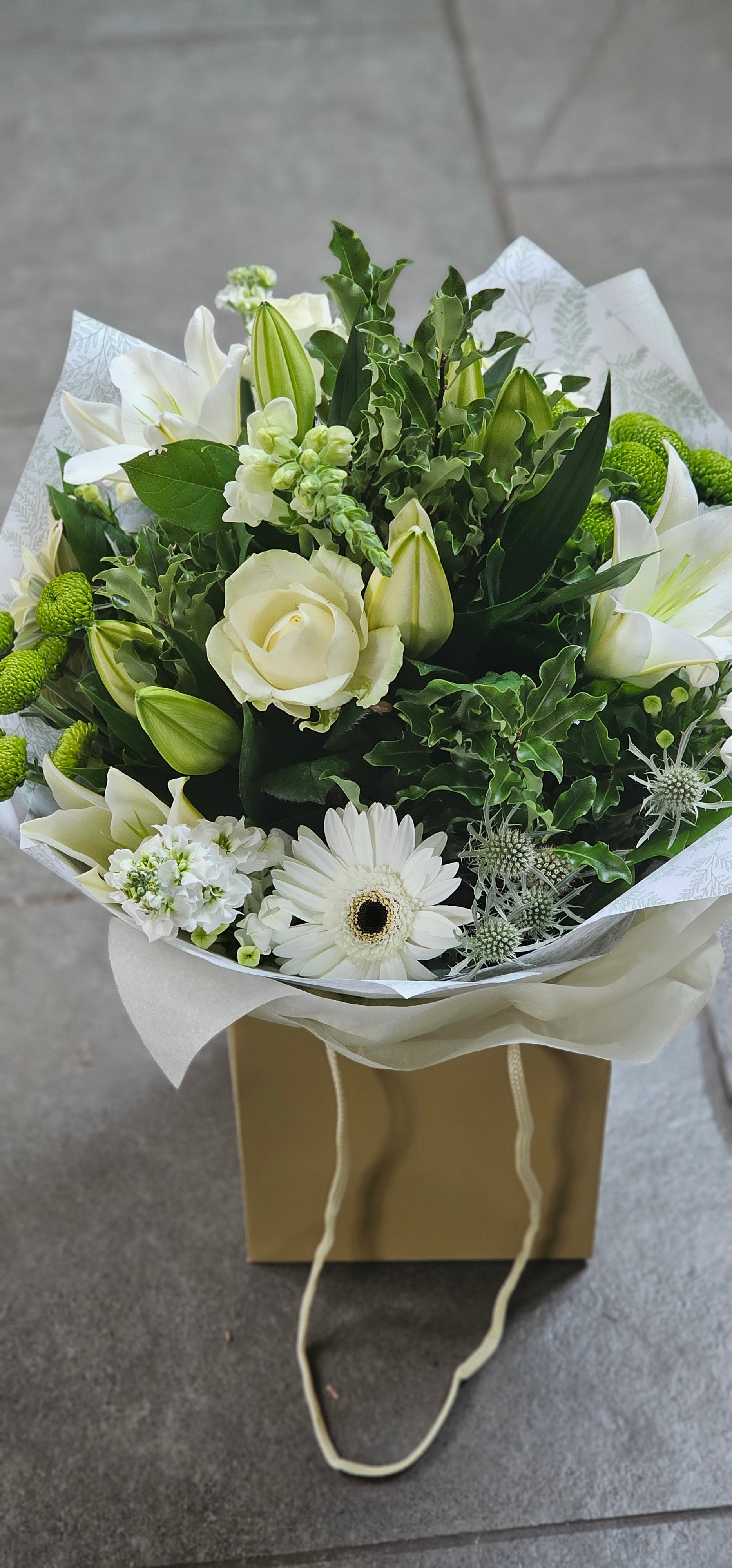 A classic design of green and white lilies, roses and carnations in an aqua bag.