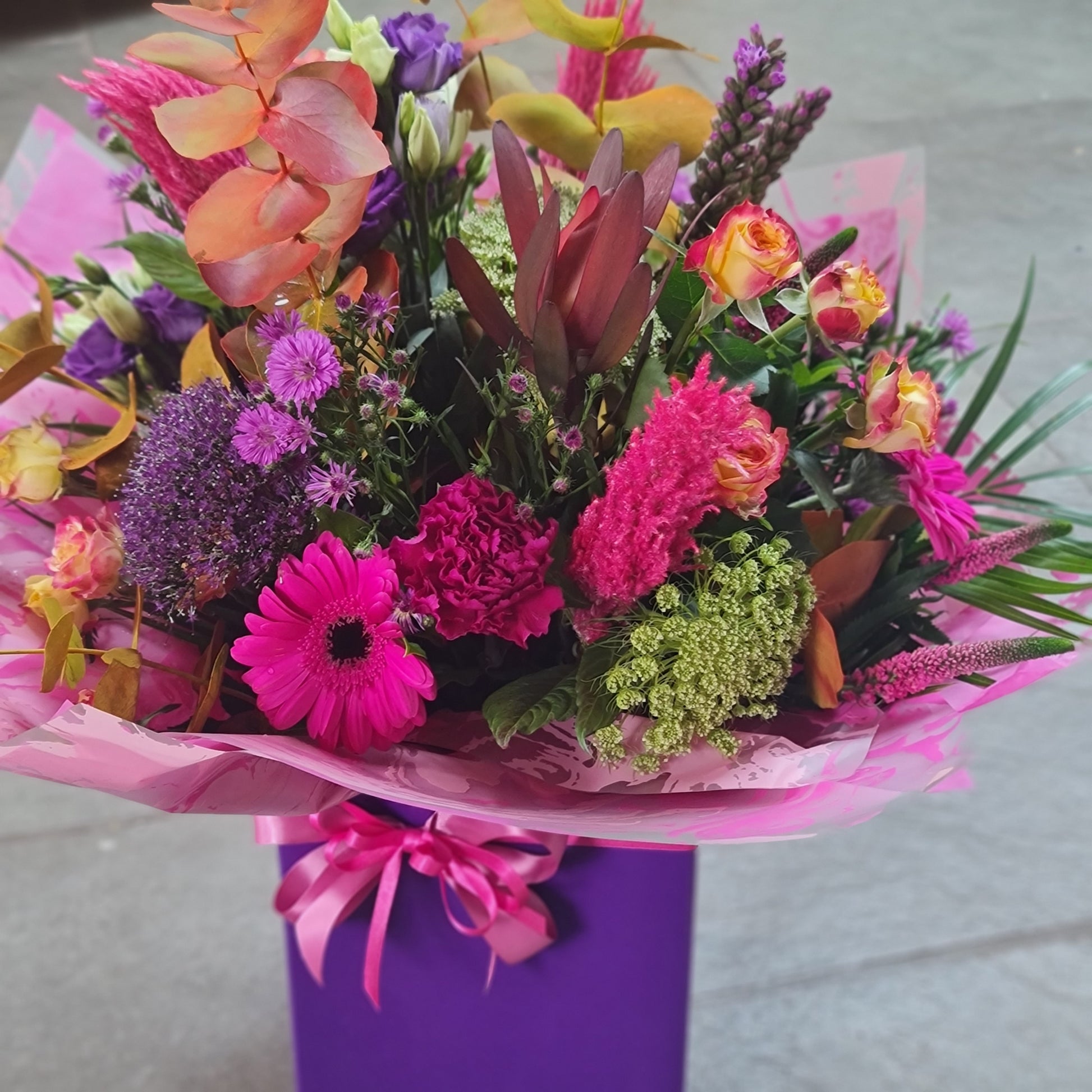 This stunning bouquet is made up of deep purples, autumn orange and cerise pinks. Each colour complements each other. It includes gerbras, carnations and roses.