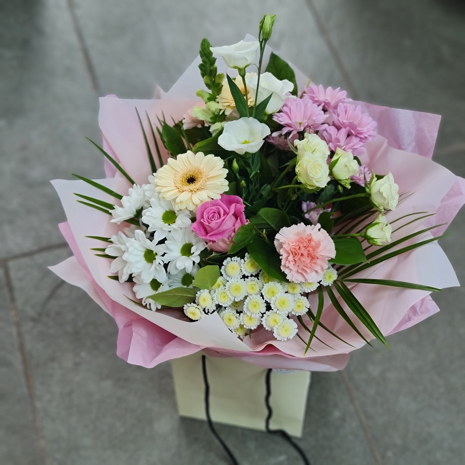 A simple but stunning Aqua bouquet of Pink, white and cream flowers, including, a Rose, Carnations and Gerberas.
