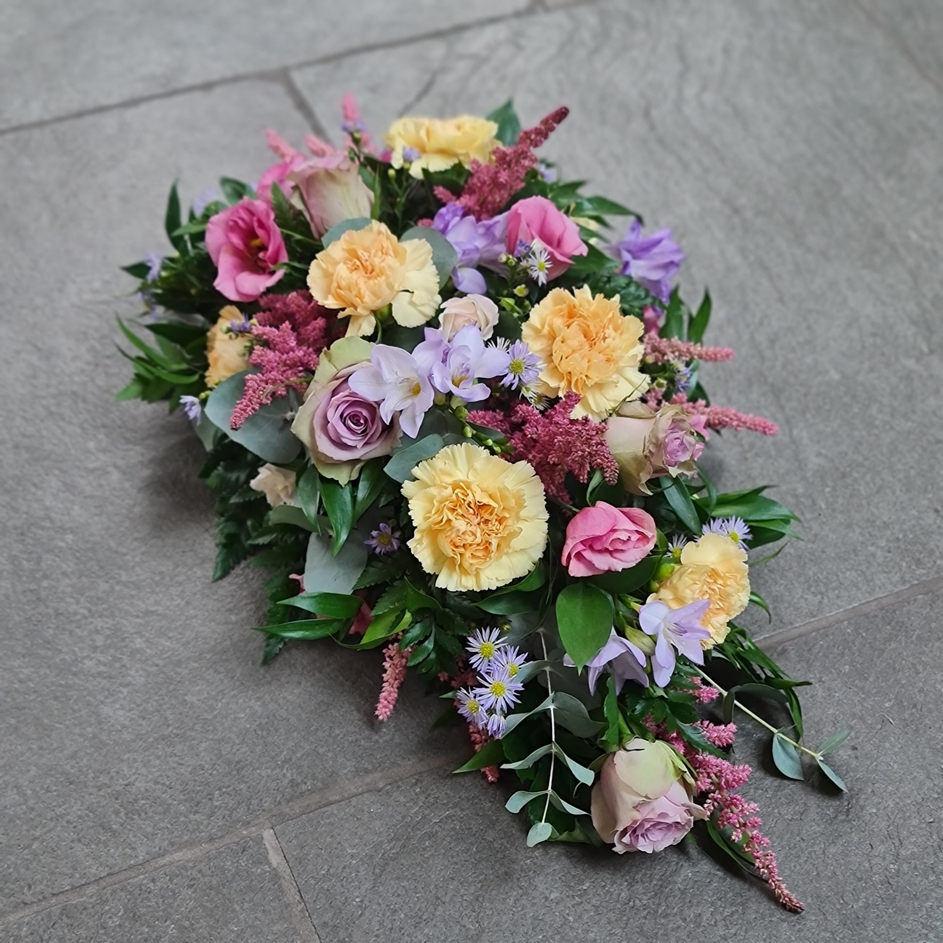 A beautiful single ended spray in pastel colours, includes roses, carnations and lisianthus.