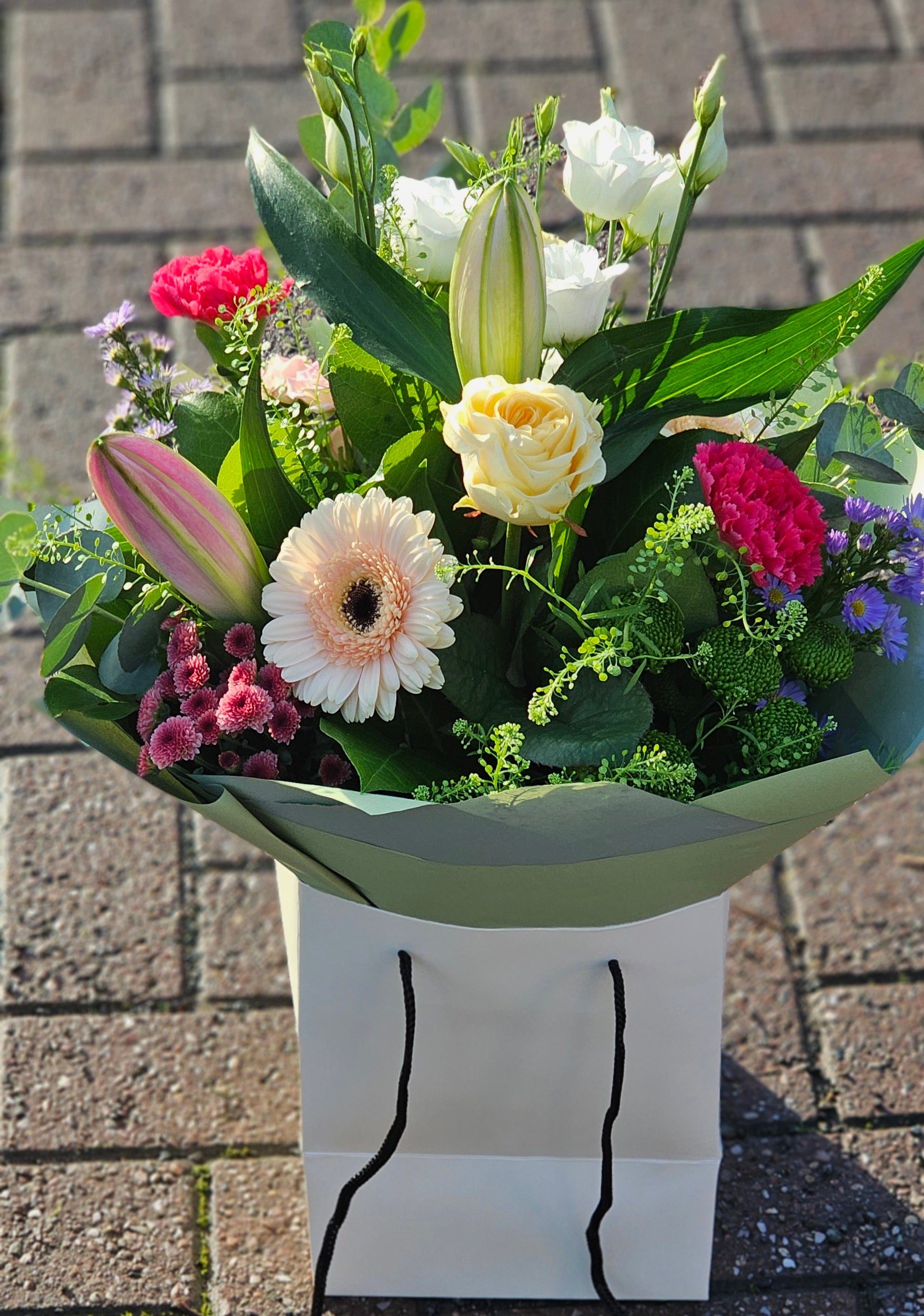 This stunning handtied bouquet is made up of so many rainbow colours, perfect to brighten anyone's day. It includes a rose, gerbras and carnations.